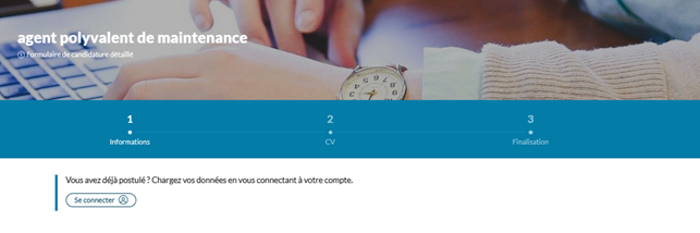 Lorsque le candidat clique sur le bouton « Postuler » ou sur « Candidature spontanée », le formulaire de candidature est affiché. Il se décompose en 2 parties : Informations et CV.